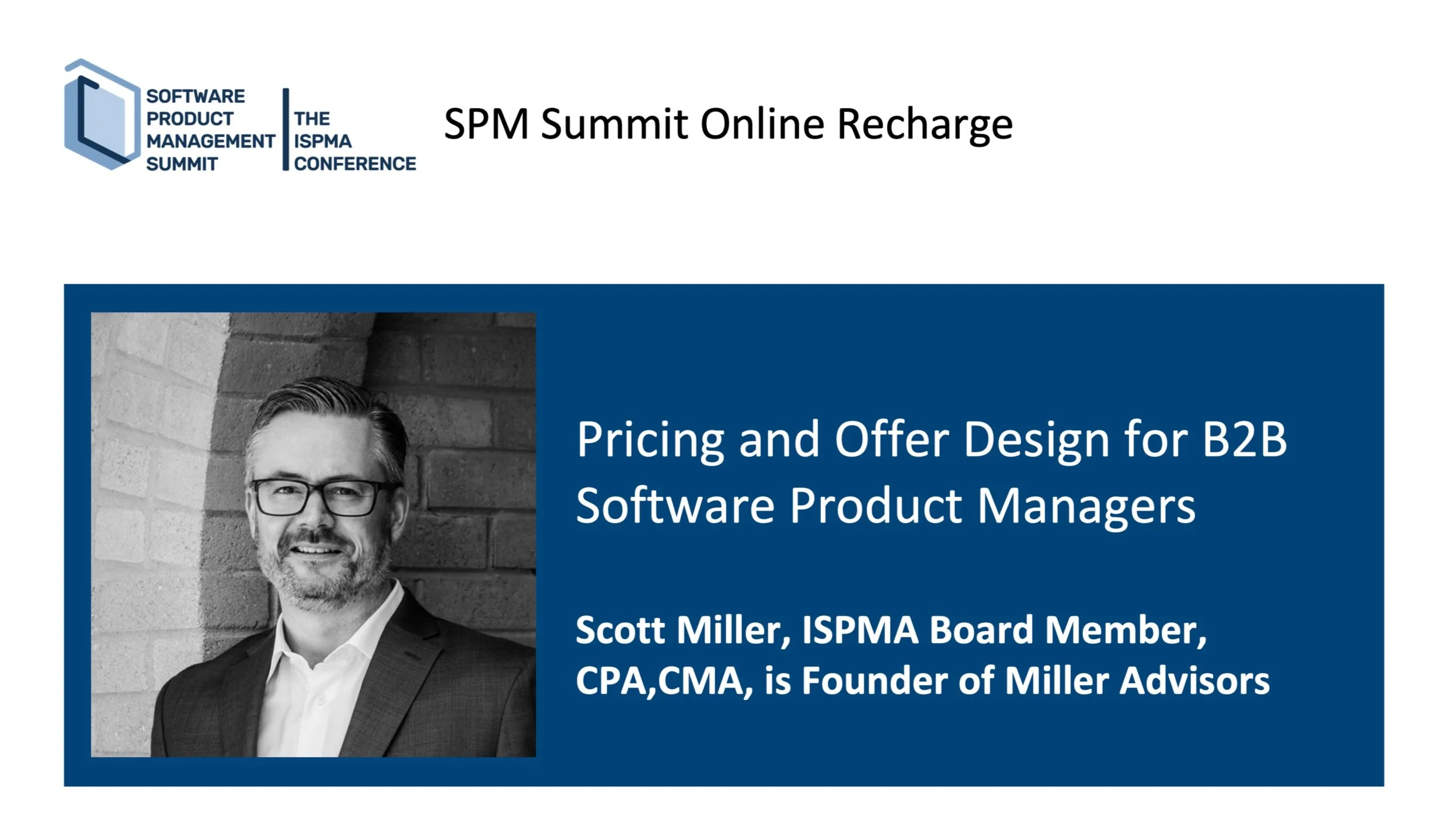 Scott Miller, ISPMA Board Member, CPA,CMA, is Founder of Miller Advisors (www.miller-advisors.com and www.B2Bsoftwarepricing.com), a boutique consulting practice specializing in pricing and offer design strategies for global B2B digital companies.